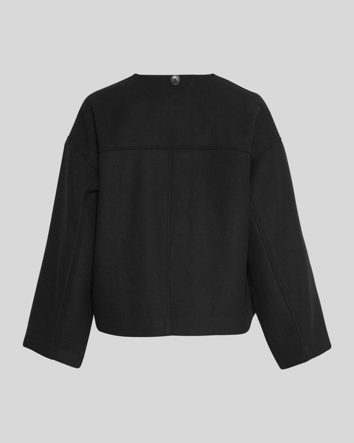 A short, wool jacket with an attachable scarf, to keep you warm. The scarf is attached by a button in the back. The jacket also features a v-neckline in the front and a single button closure.