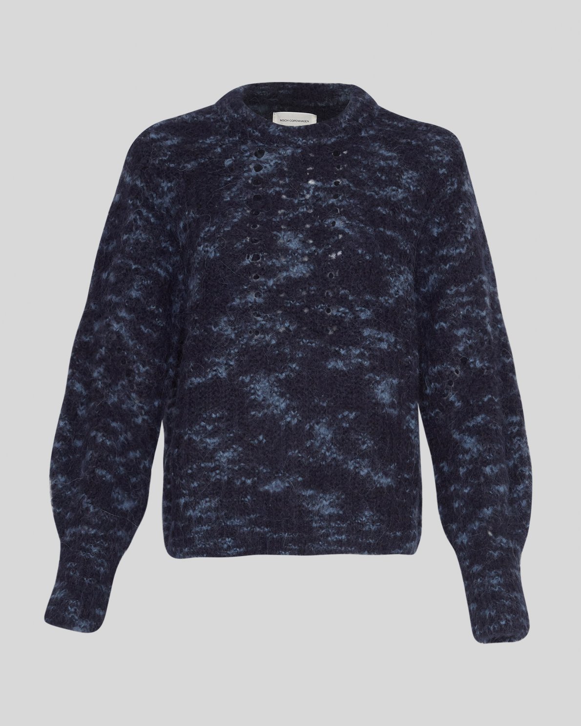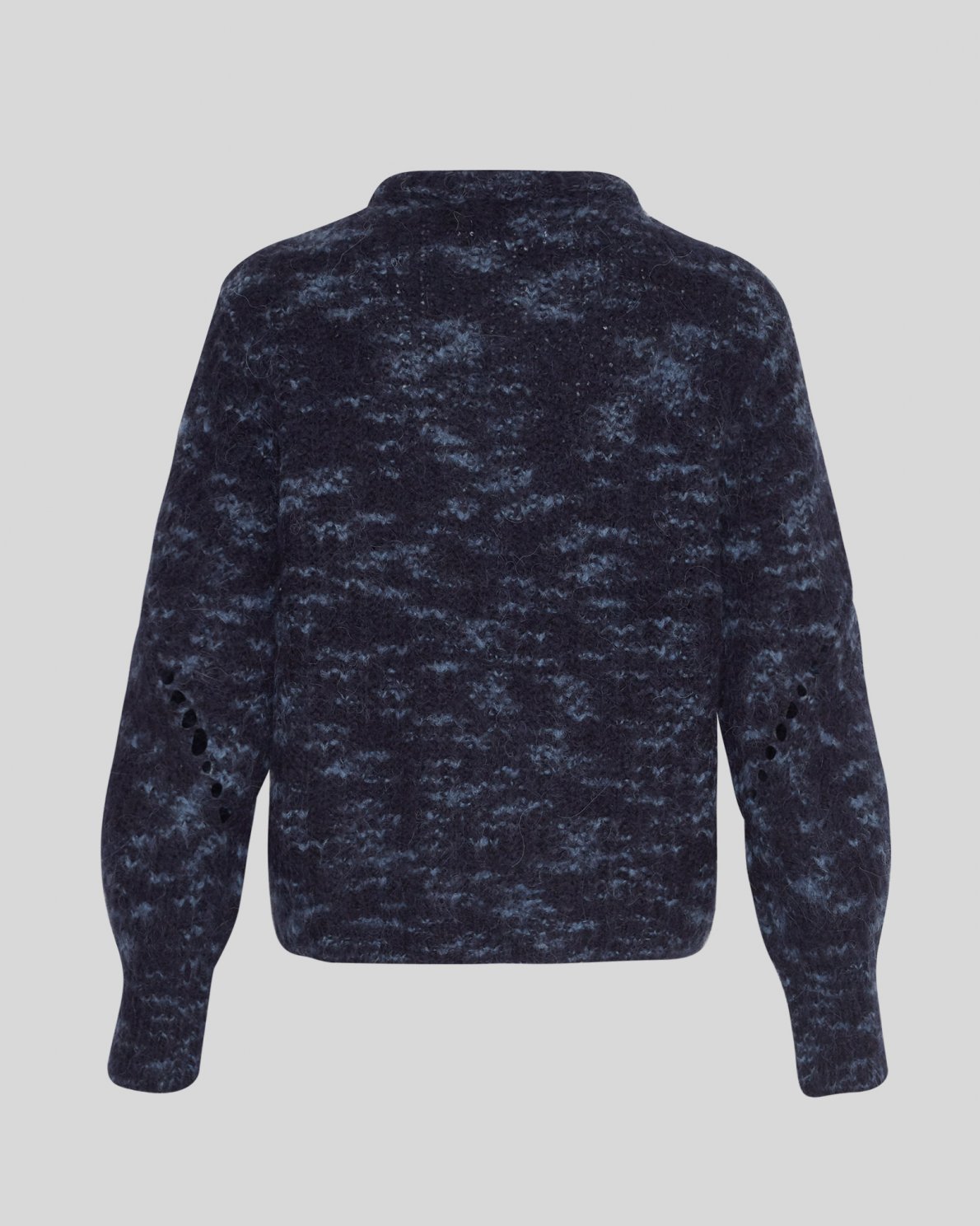 A chunky knit, made from a beautiful space coloured thread, creating a unique colouring. The knit features a round neckline and a longer, and slim cuff. It has slightly dropped shoulders to create a slouchy effect.