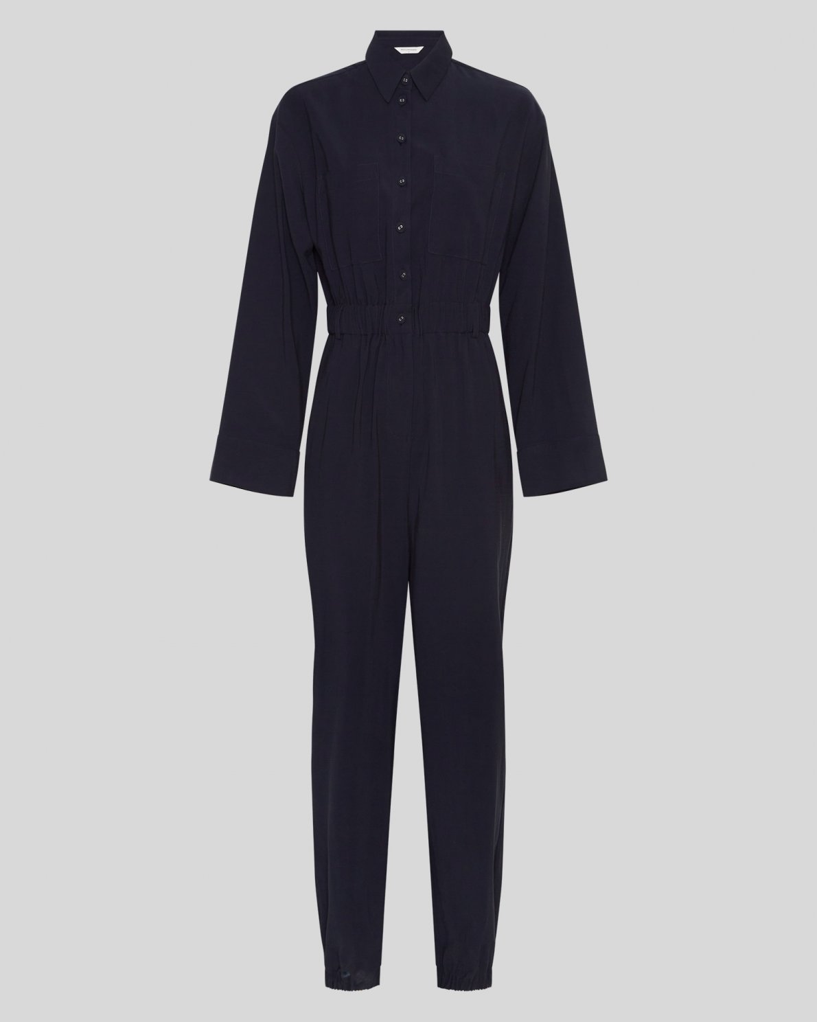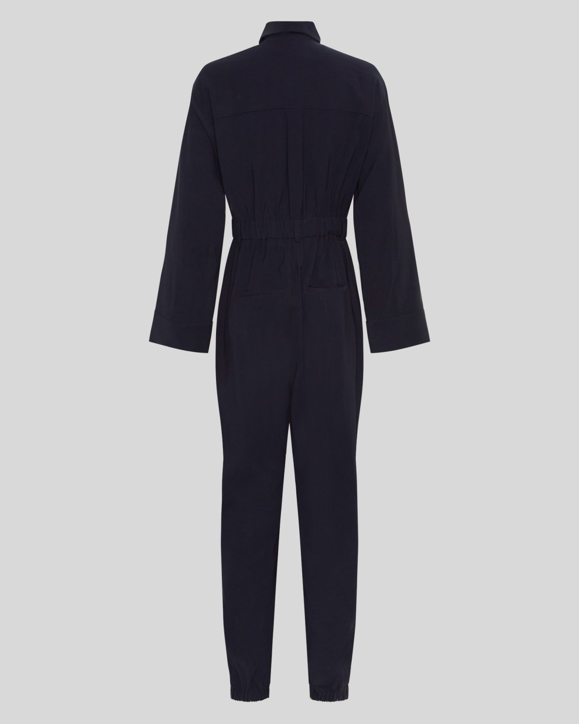 The Asana jumpsuit is a utility inspired jumpsuit that features a top half similar to a shirt with its collar and button down closure. The waist is a wemi-wide elastic band that gives the top half a bit of a loose look and will enhance your waist at the sam time. The pant leg is straight fitted.