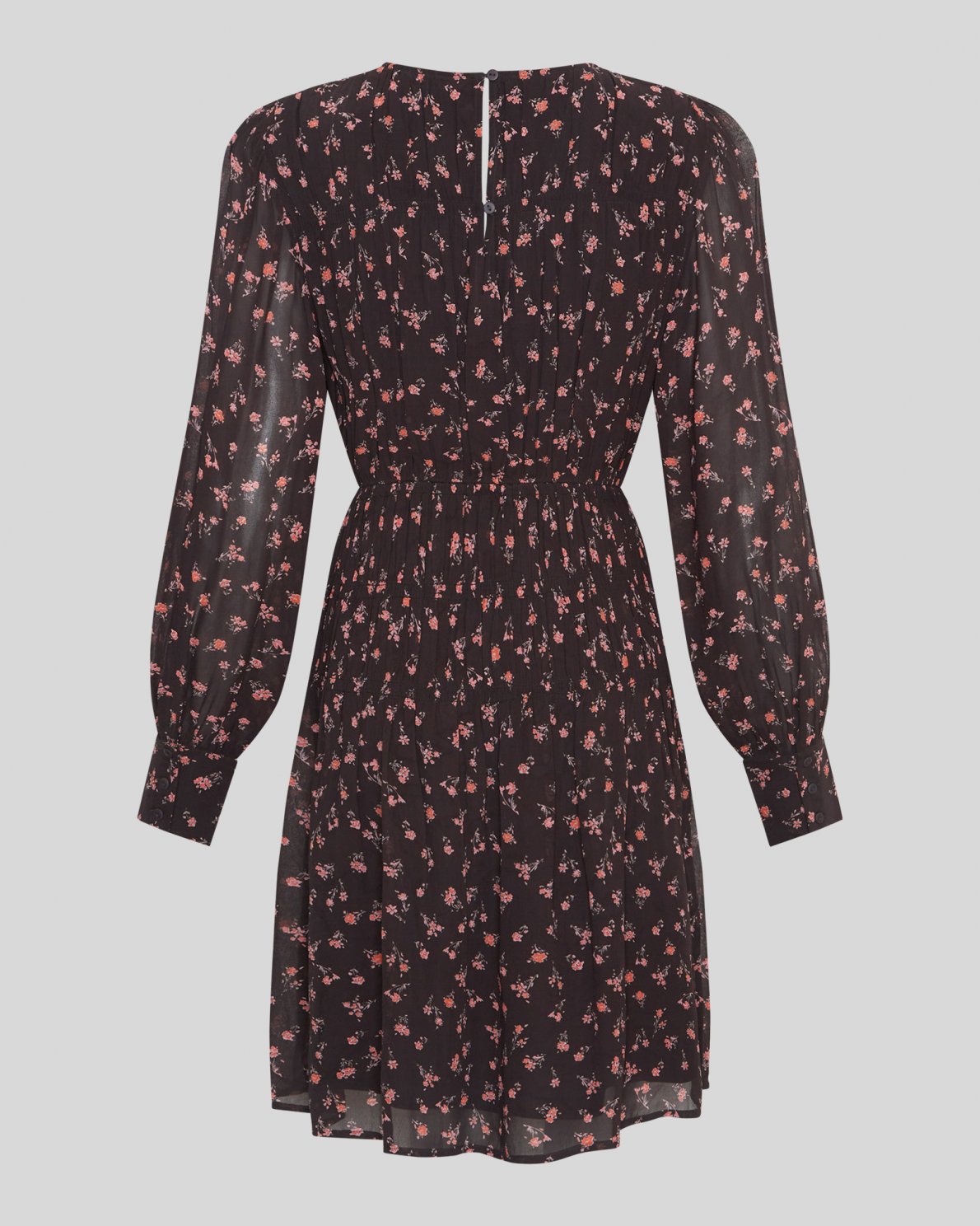 Short dress with a mesh outer layer and a black slip dress underneath. The dress features long sleeves with wide cuffs, a round neckline and an elasticated waist. Small buttons are placed at the front.