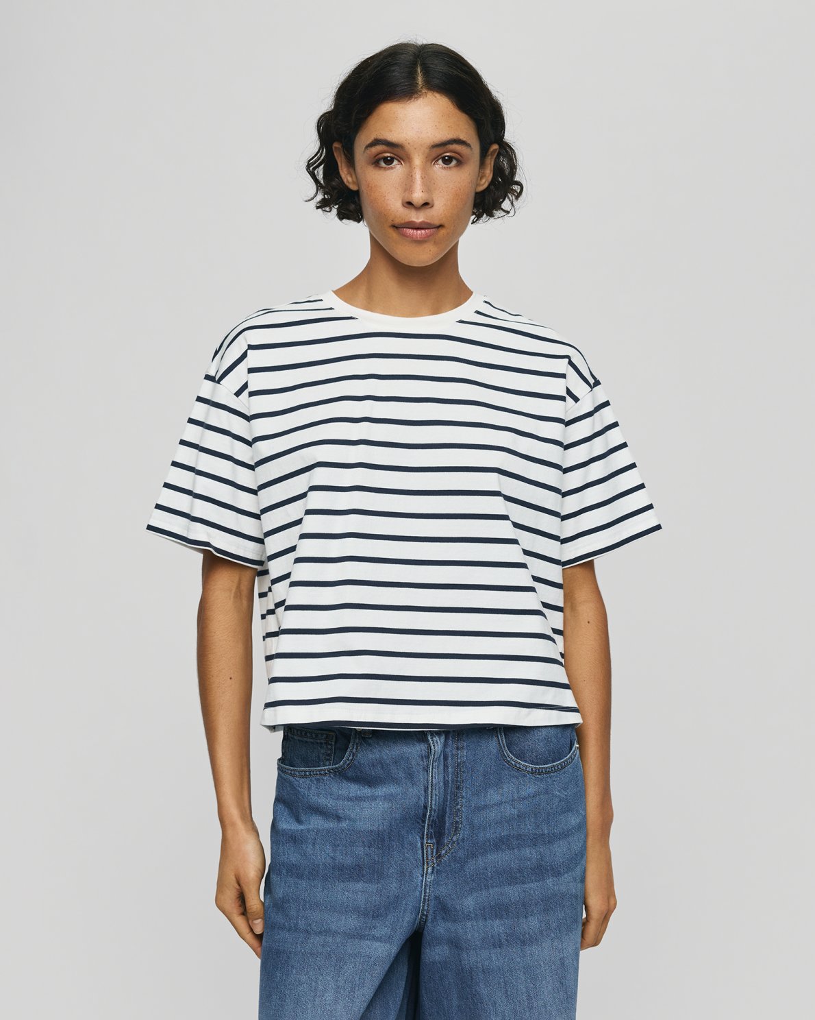 This t-shirt has a boxy fit. The model is 179cm and wears a size S/M.