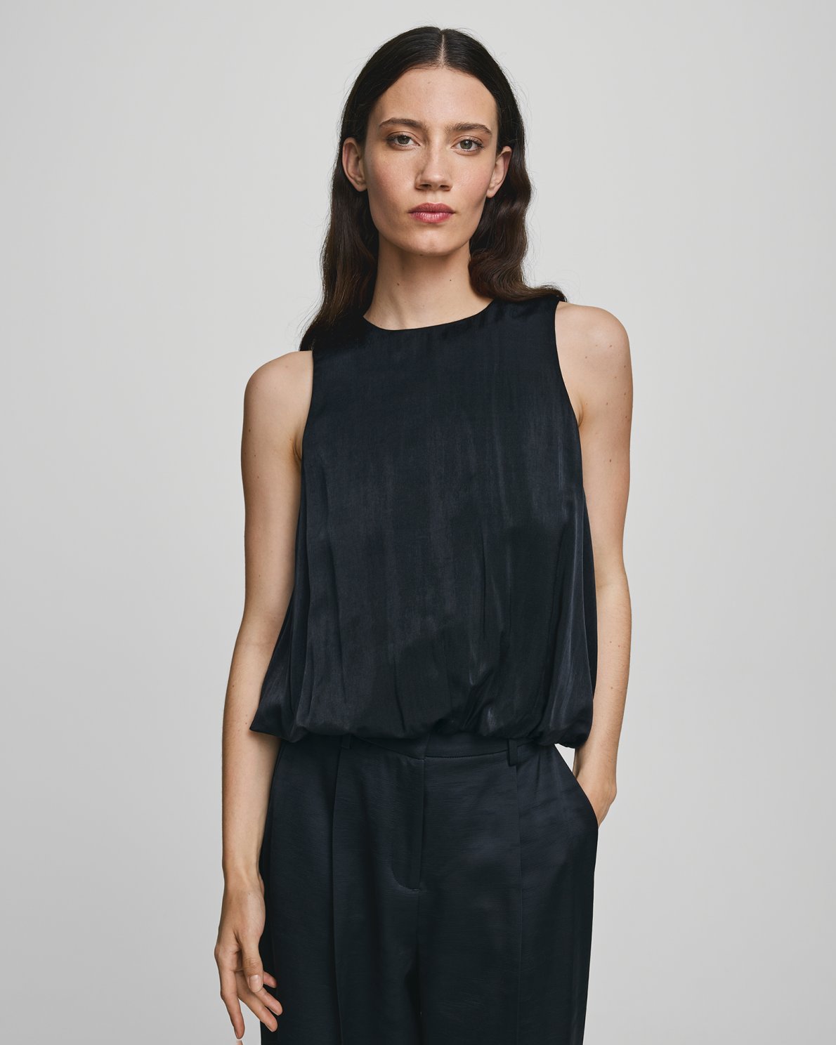 The MSCH Ofelia Nicholina SL Top is a stylish sleeveless blouse with a round neckline and a subtle shiny finish that adds sophistication. The discreet elastic hem creates a flattering silhouette, making it ideal for both casual wear and evening occasions. In classic black, it's easy to style with anything from jeans to tailored trousers or skirts.