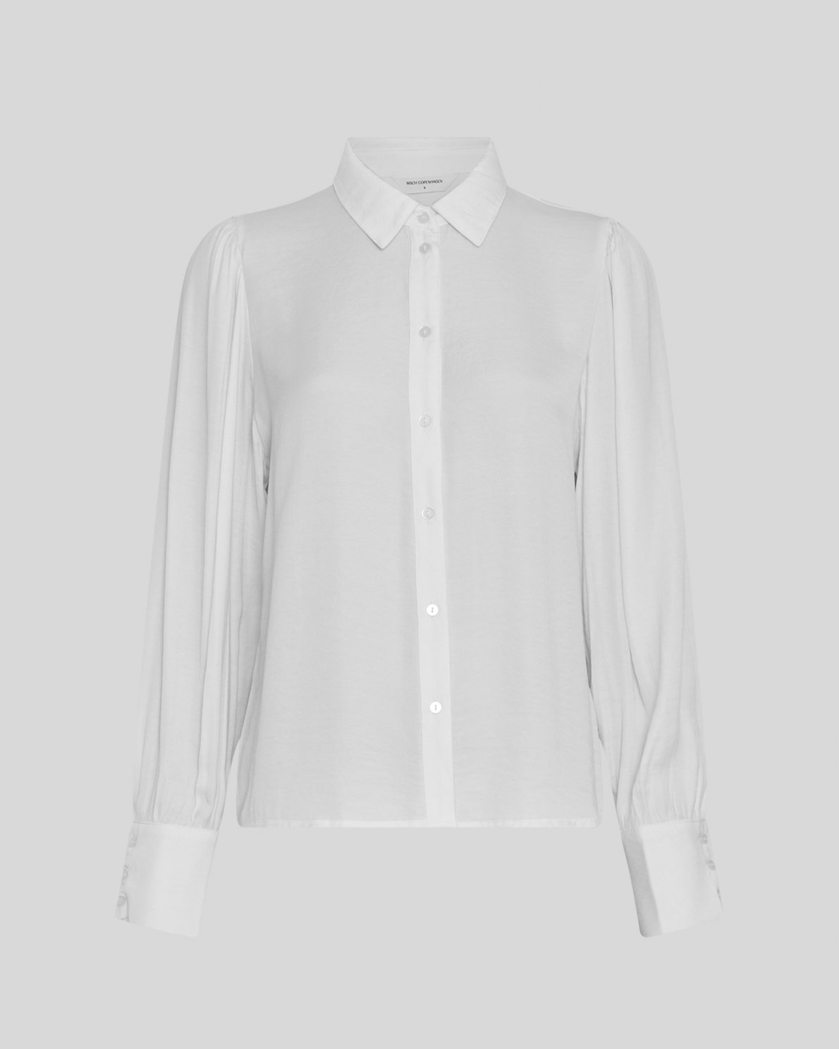 The Maluca shirt is a combination of classic and trendy with a touch of the pyjamas trend. It's lightweight and flowy, with ballon sleeves, a classic collar and cuffs. The white colour and the shiny look to the material makes it perfect for dressing up jeans, or used in a more formal occasion.