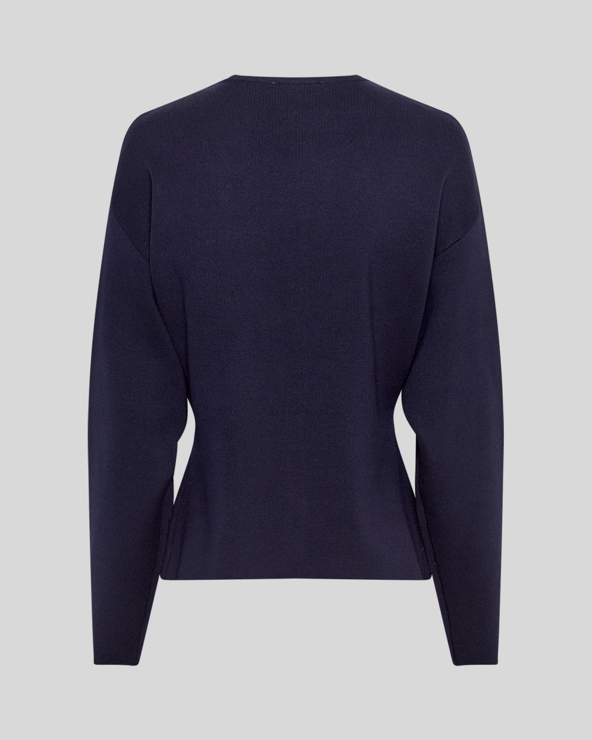 The Mirielle cardigan is a soft yet firmly knitted cardiagn with an extraordinary silhuouette. It features a round neckline, with dropped loose shoulders and sleeves, creating a voluminous top of the style. The waist is snatched, creating an hourglass shape. The buttons only goes around half way down the front. Style this with a pair of suit pants for the perfect combination of business and casual.