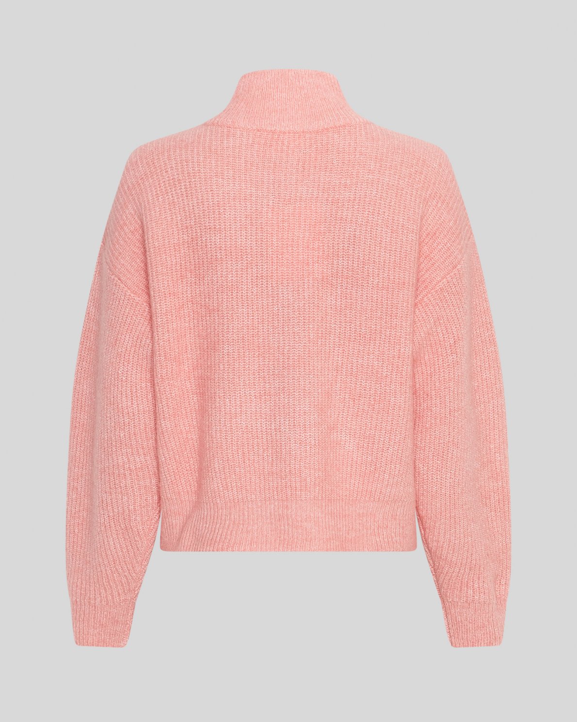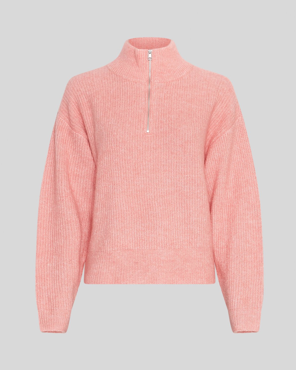 This pullover has a boxy fit. The pullover features a high neck with a half zip.