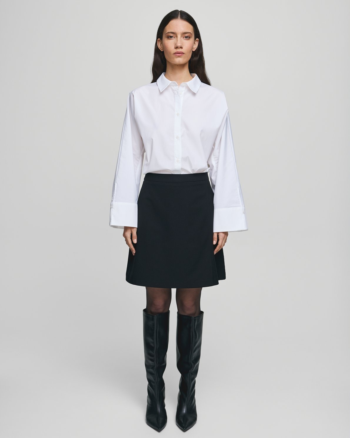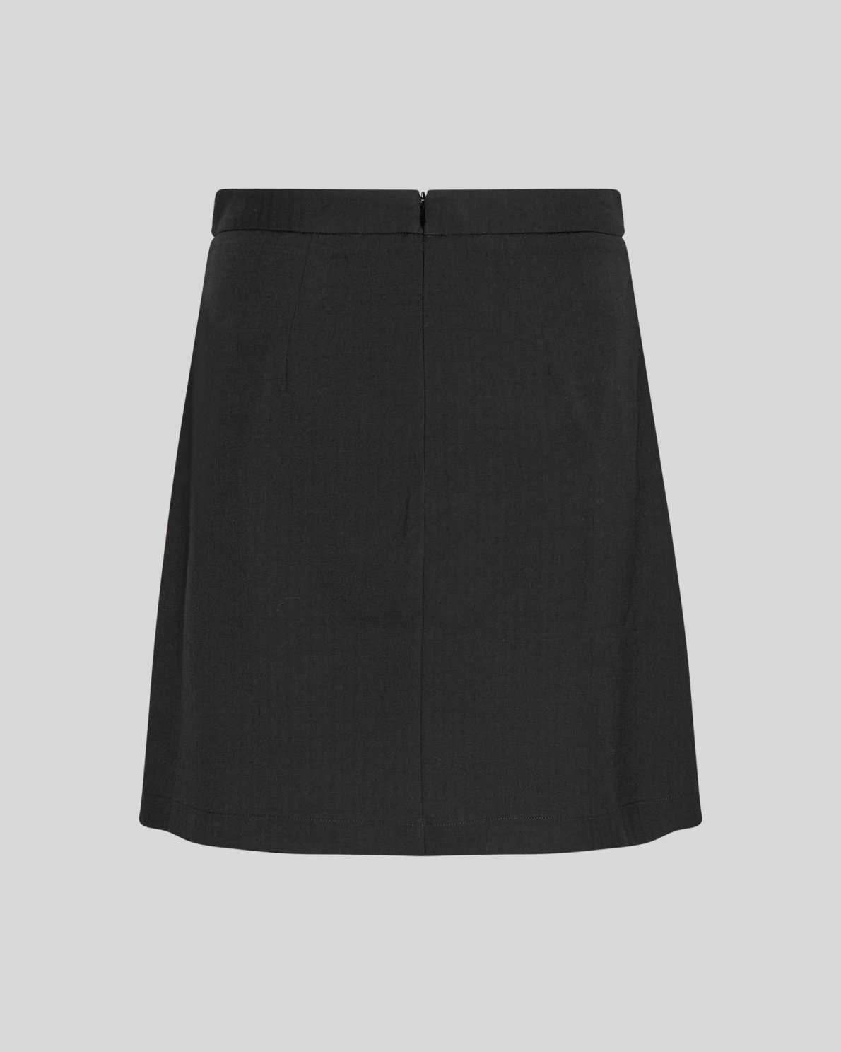 This skirt has a regualr fit, with a soft A shape. The model is 173cm and wears a size S. The skirt is a classic, black mini skirt with a high waisted design and a zip clousure at the back. The material has a subtle stripe to it.