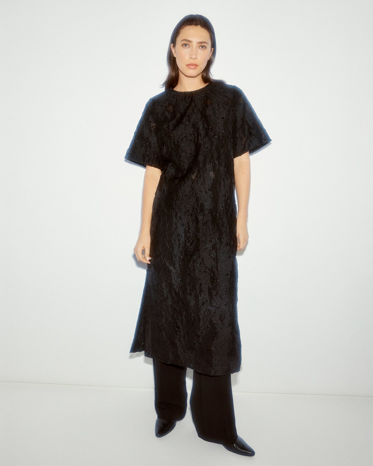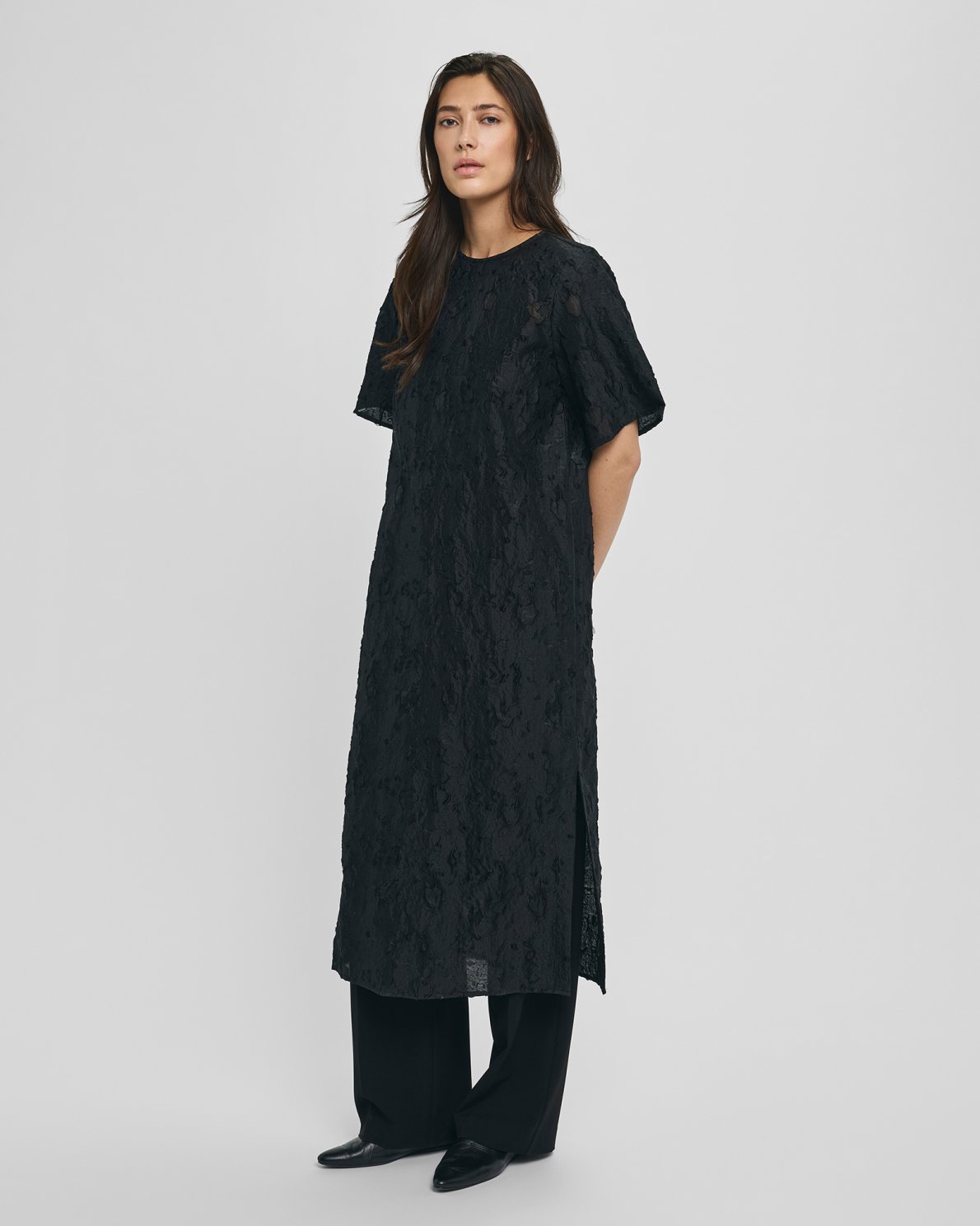 MSCHLakshmi 2/4 Dress is an elegant ankle-length dress made from a structured, slightly shiny fabric. It features a round neckline, closes with a small button, short sleeves, and a straight silhouette that drapes naturally. The textured finish adds a refined touch.