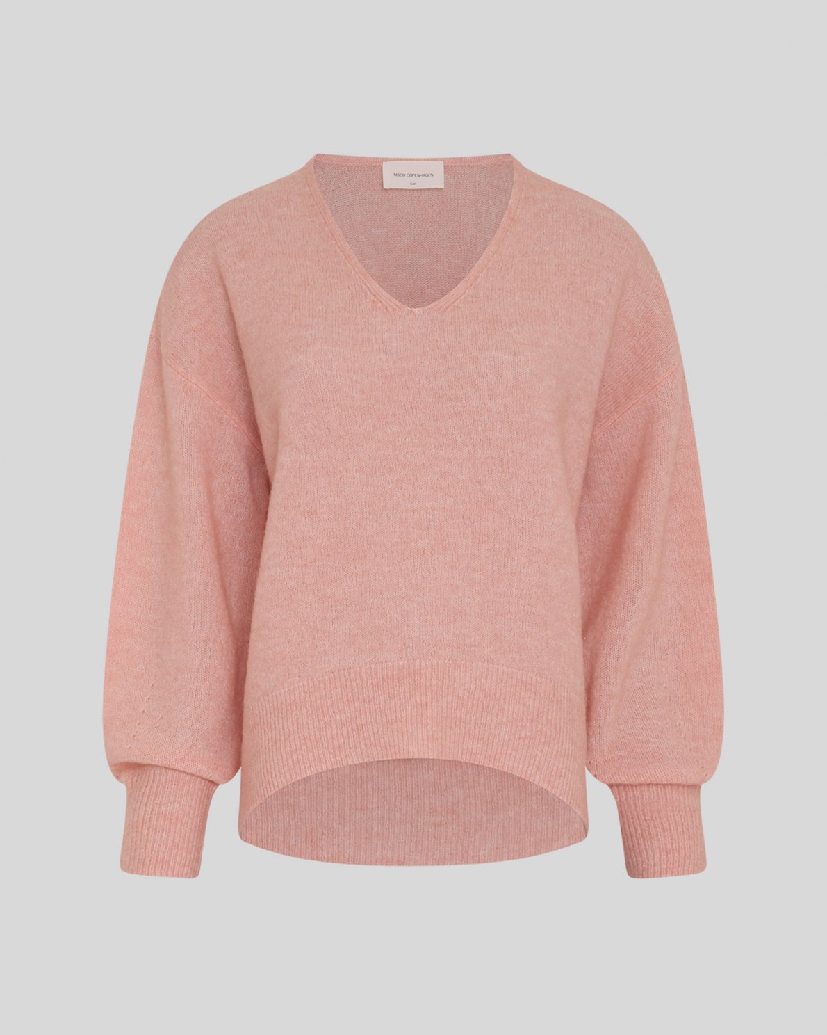 Knitted pullover with v-neckline. Long sleeves with ribbed cuffs and ribbed hem. Designed with dropped shoulders.