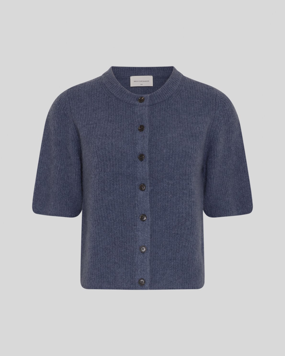 Knitted cardigan with a round neckline and full button closure. Designed with short sleeves and a lightly textured knit with ribbed edges.