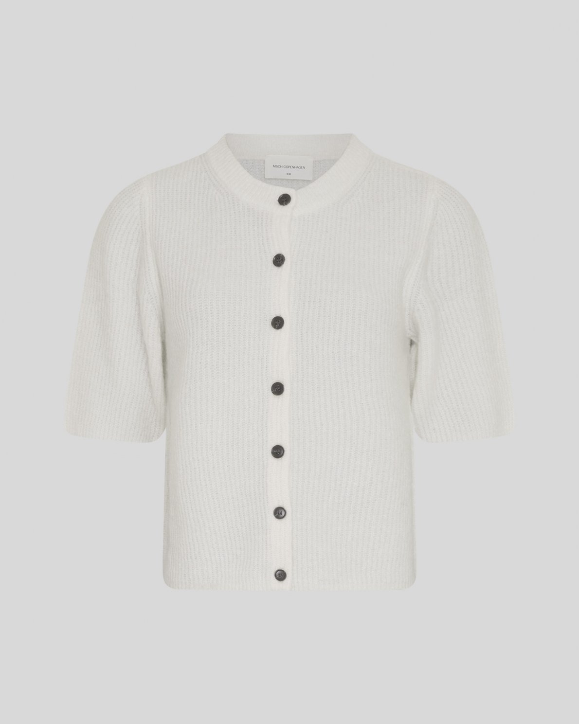 Knitted cardigan with a round neckline and full button closure. Designed with short sleeves and a lightly textured knit with ribbed edges.