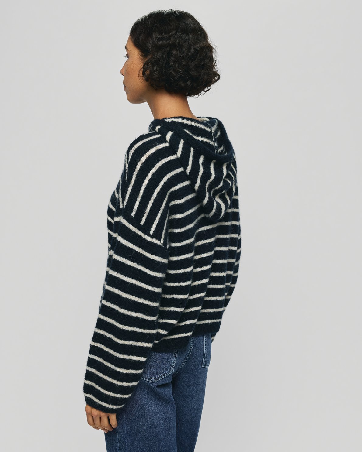 Knitted cardigan with horizontal stripes and zipper closure. Designed with a hood and long sleeves with dropped shoulders.