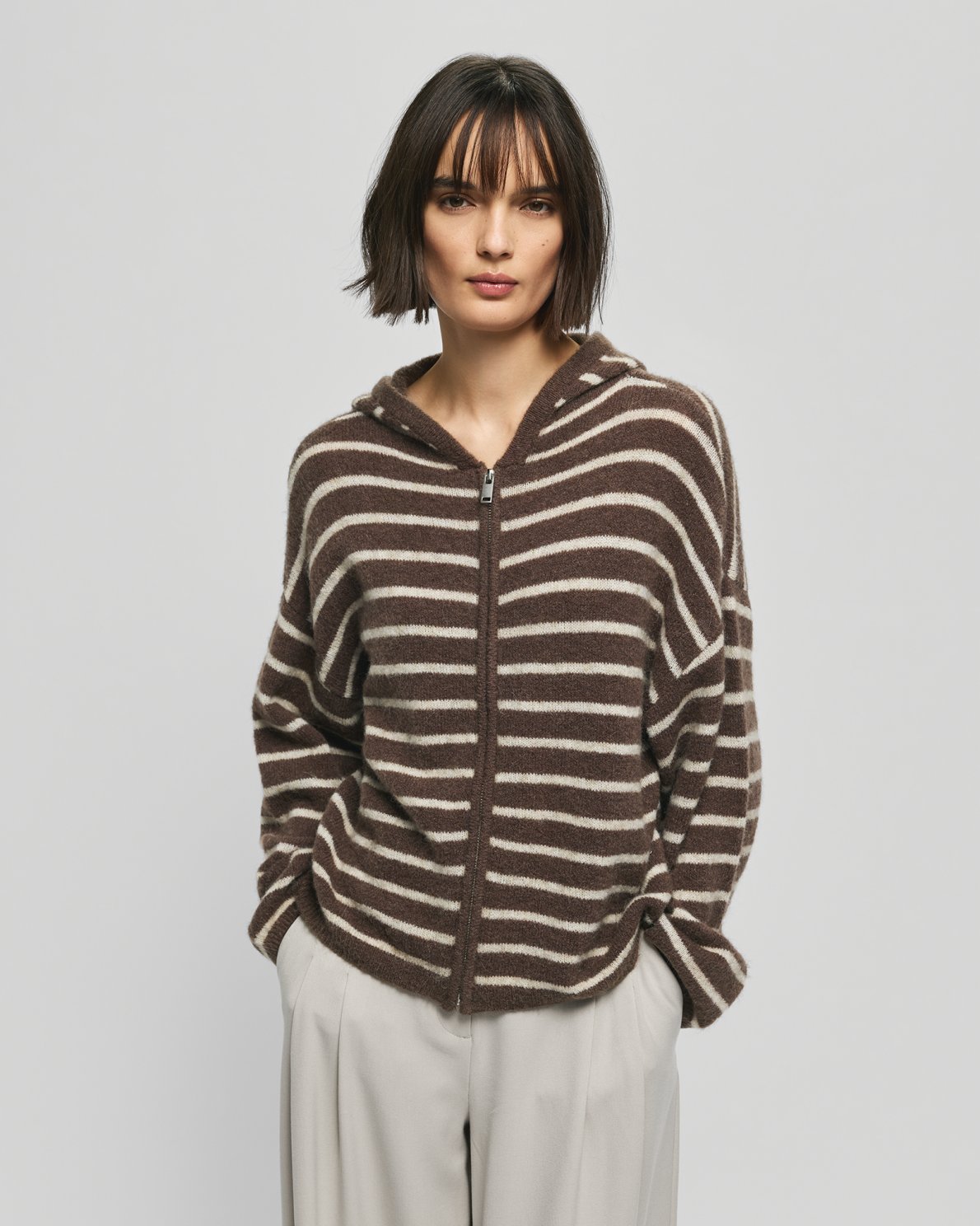 Knitted cardigan with horizontal stripes and zipper closure. Designed with a hood and long sleeves with dropped shoulders.
