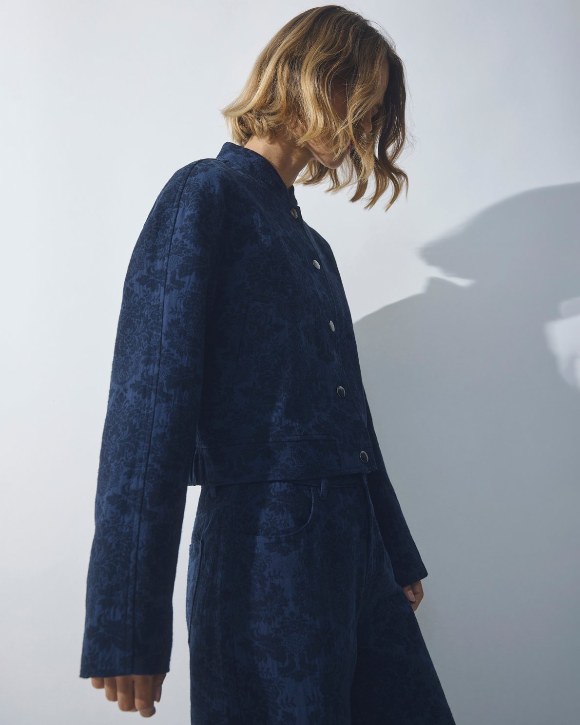 Short jacket in woven fabric with a textured, patterned surface. Stand collar and snap button closure at front. Straight sleeves and clean hemline.
