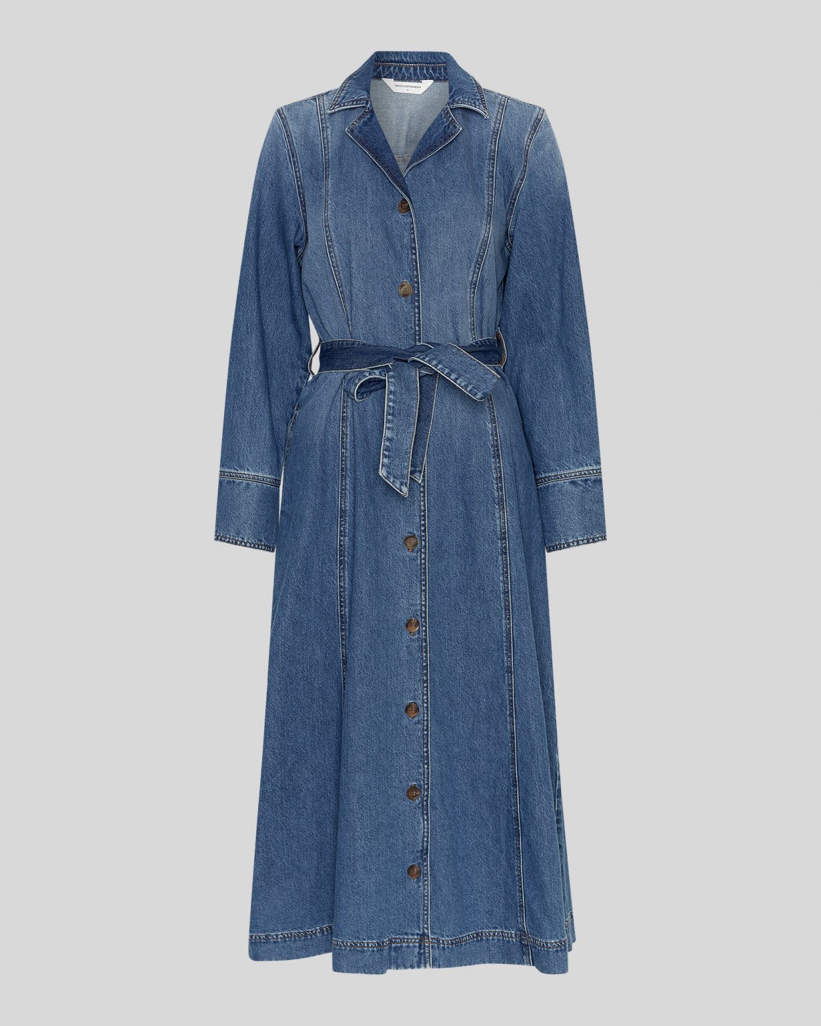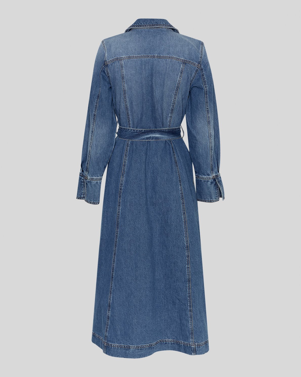 This long denim shirt dress features a timeless and classic look with a feminine silhouette. Designed with a collar, full button closure and long sleeves with cuffs. The adjustable tie belt defines the waist and allows for a customizable fit. A versatile denim piece suitable for both everyday wear and more polished occasions.