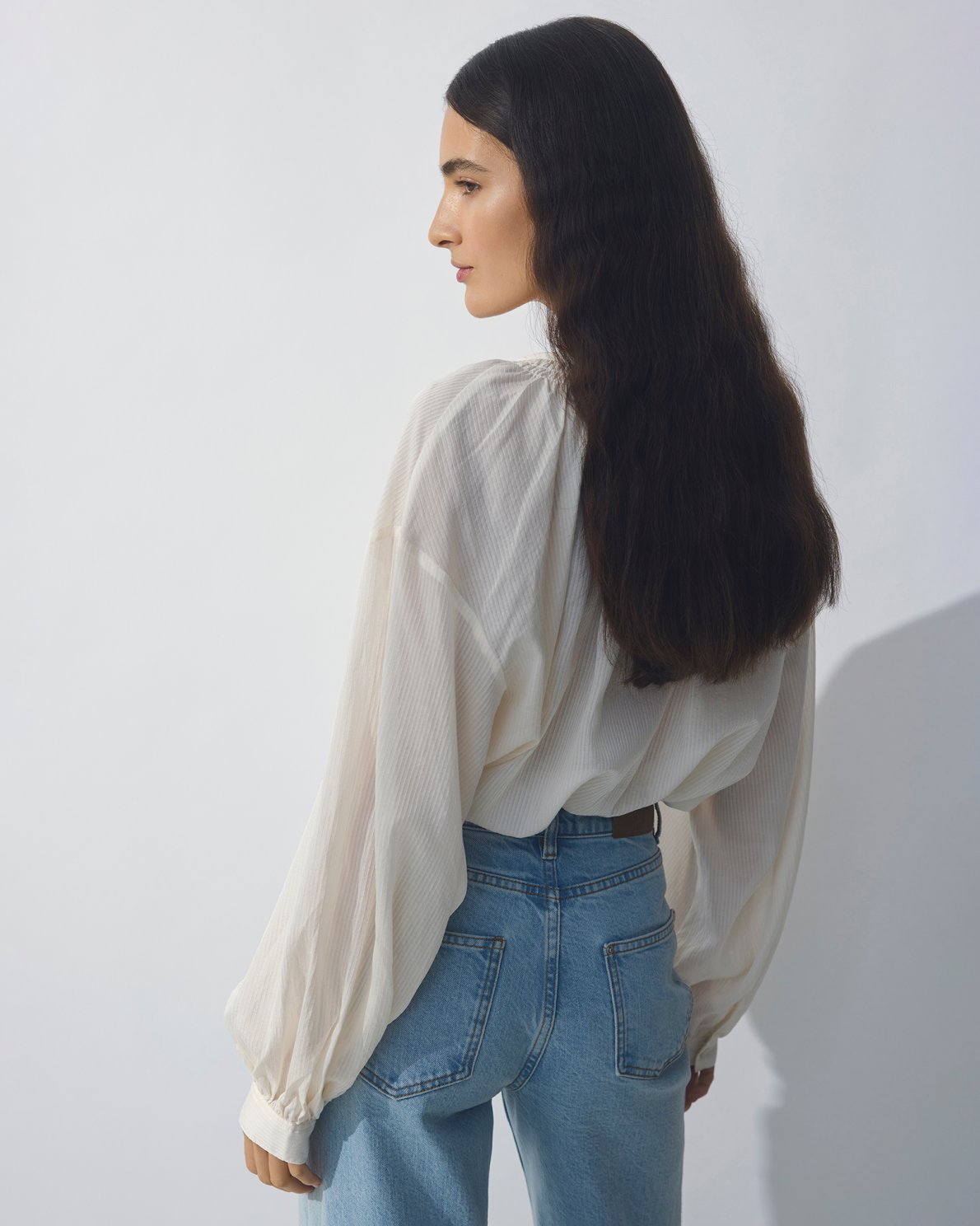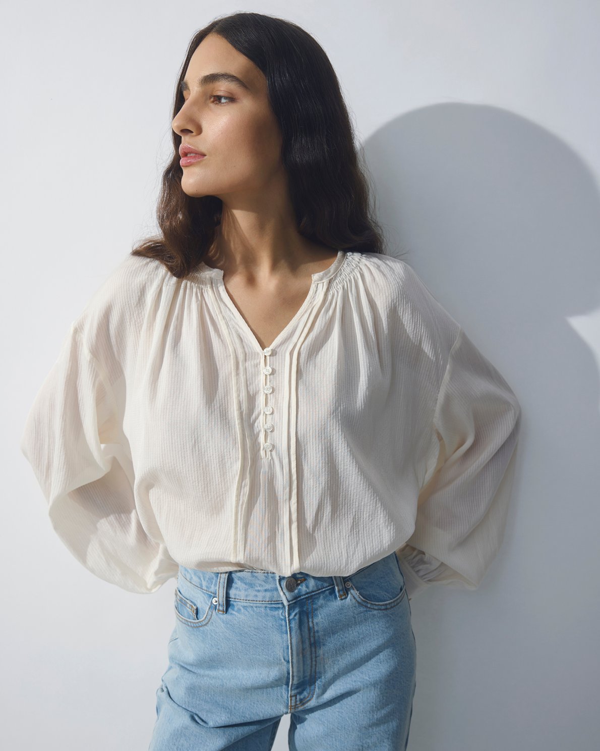 Lightweight and elegant blouse crafted from a softly textured fabric with delicate pleat details at the shoulders, creating a feminine and relaxed look. The blouse has a slightly sheer appearance and a comfortable fit, making it suitable for both everyday wear and more dressed-up occasions.