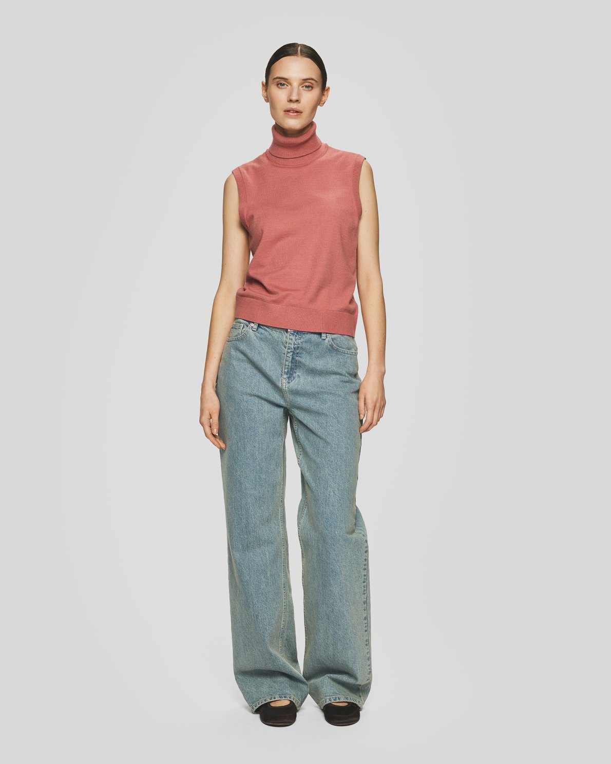 The MSCHIsabis R Vest is a knitted sleeveless style with a high ribbed turtleneck and a clean, minimal silhouette. It features ribbed edges at the neckline, armholes and hem, and a straight fit. The design is suitable for layering and transitional wear.