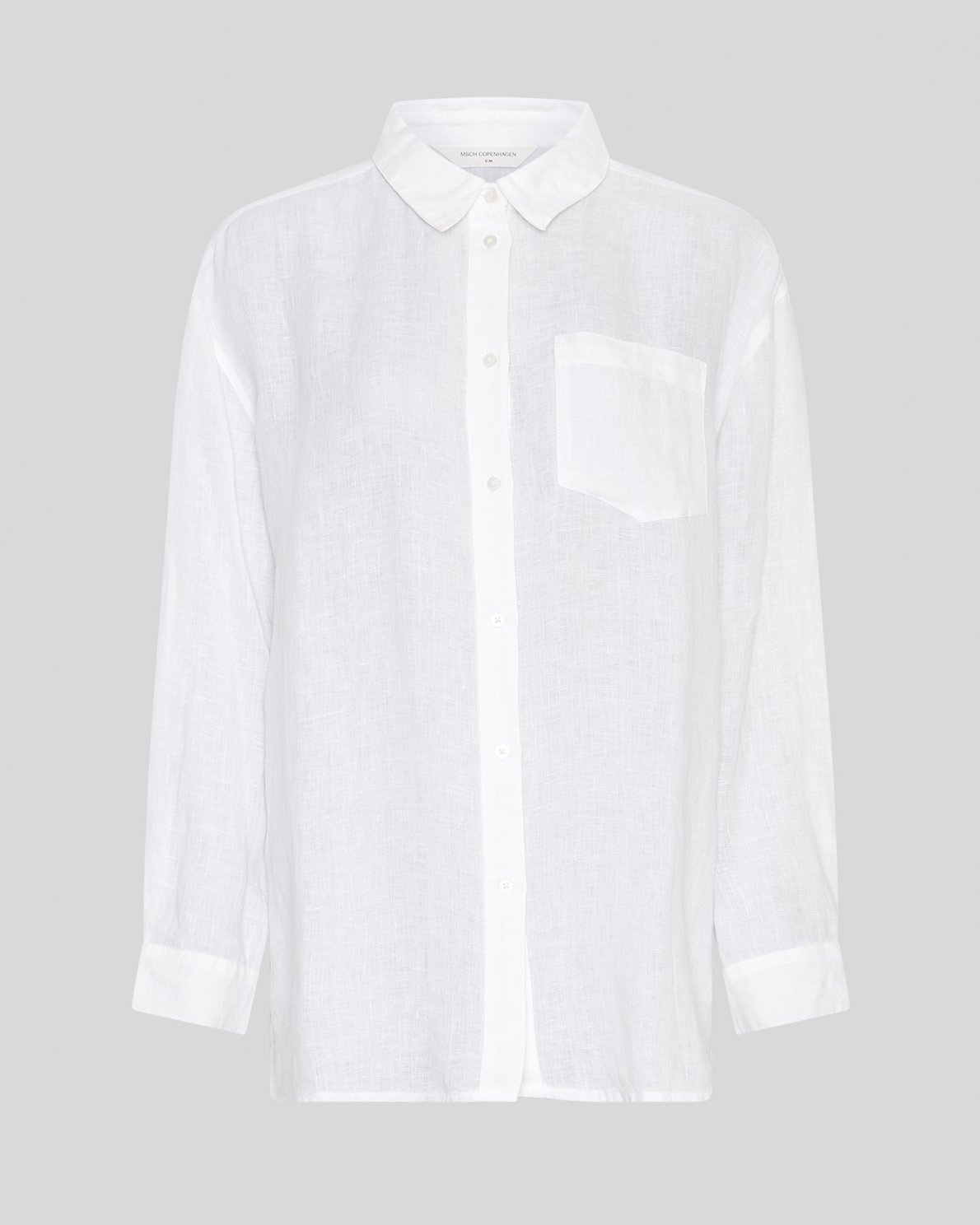 Long shirt in 100% linen with a lightweight and breathable structure. Designed with a classic shirt collar and full button closure at the front. Long sleeves with cuff and button fastening. Patch chest pocket and slightly rounded hemline. Relaxed silhouette with extended length.