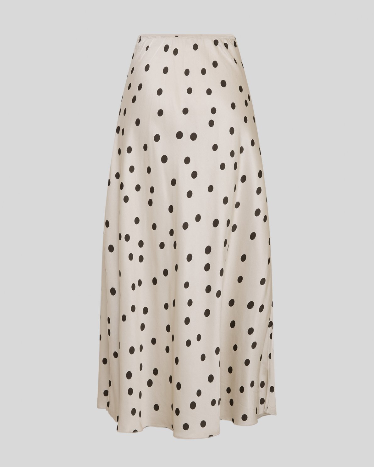 Long skirt with all-over polka dot print. Lightweight fluid quality with smooth surface. Elastic waistband and A-line silhouette with natural drape.
