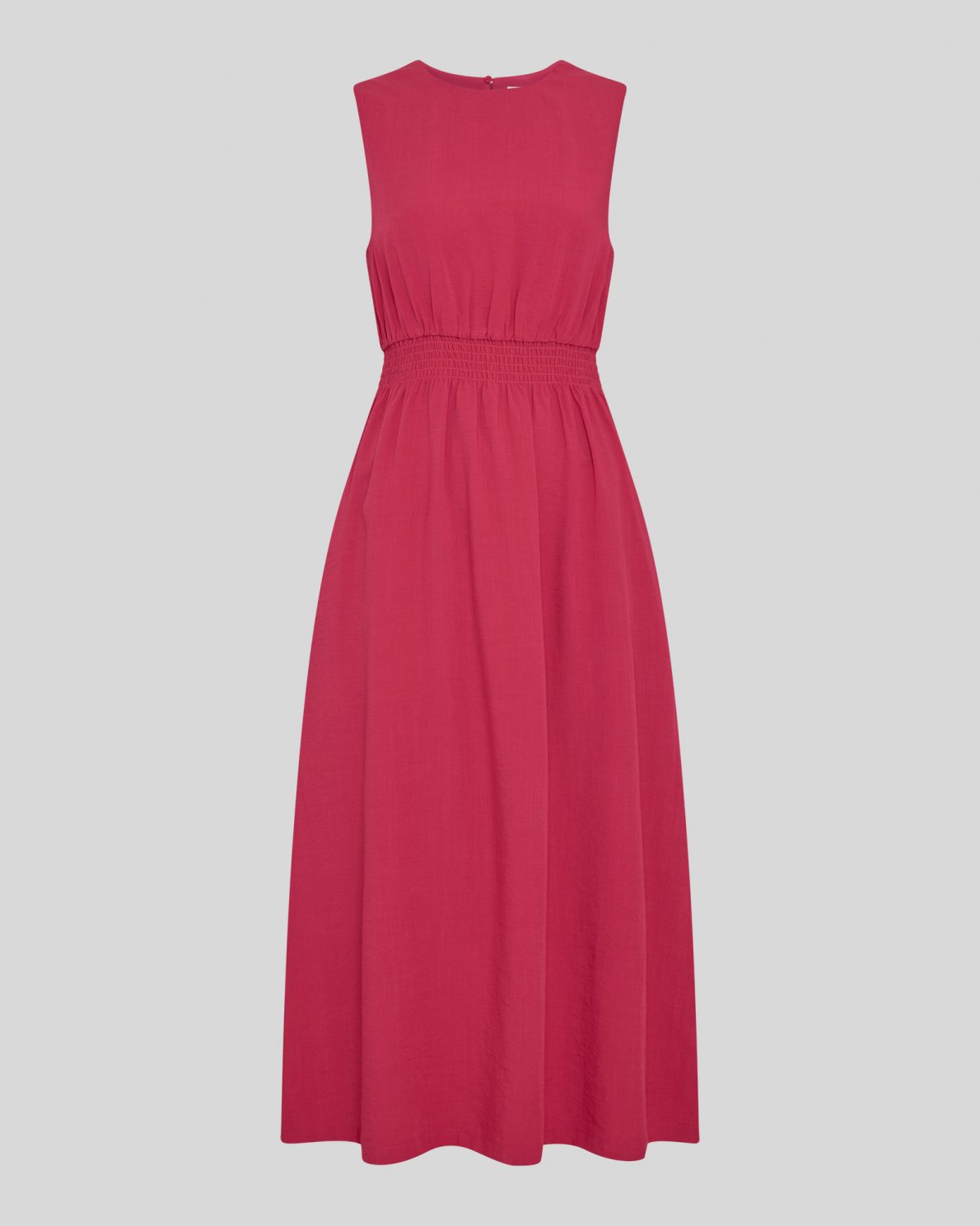 Long sleeveless dress in a lightweight woven quality. Designed with round neckline and button closure at the back. Elasticated waist with gathered effect. Straight silhouette with slight A-line skirt and full length. Fully lined.