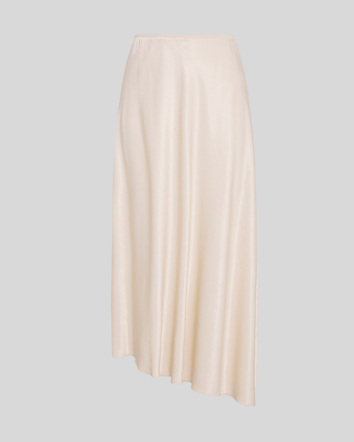 Long skirt in a satin quality with a subtle sheen. Designed with an asymmetrical hem and fluid drape. Elastic waistband for flexible fit. Slight A-line silhouette.