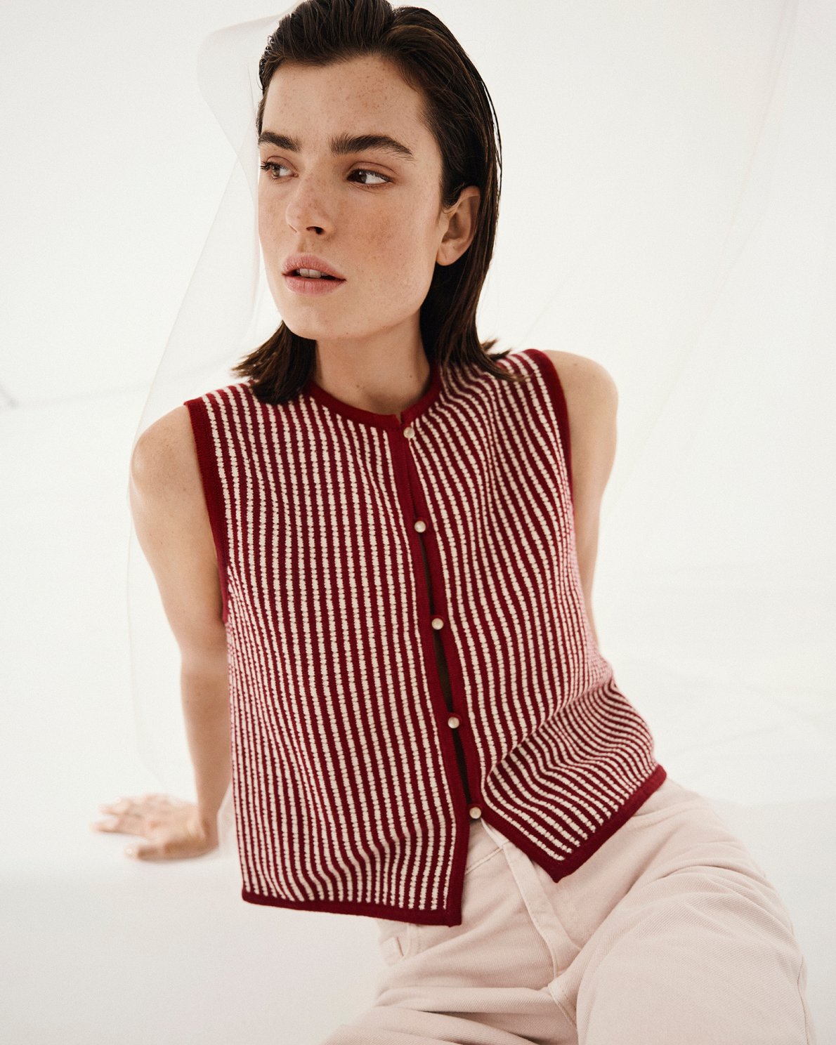 Boxy knitted vest with vertical stripes, a round neckline and front closure with ball buttons. Designed in a straight sleeveless silhouette.