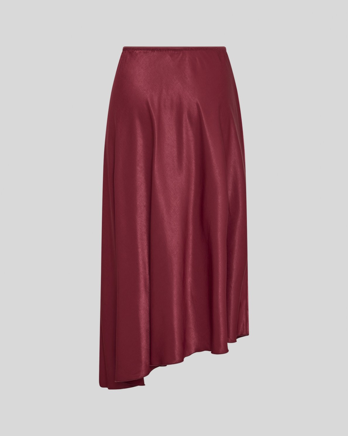 Long skirt in a satin quality with a subtle sheen. Designed with an asymmetrical hem and fluid drape. Elastic waistband for flexible fit. Slight A-line silhouette.
