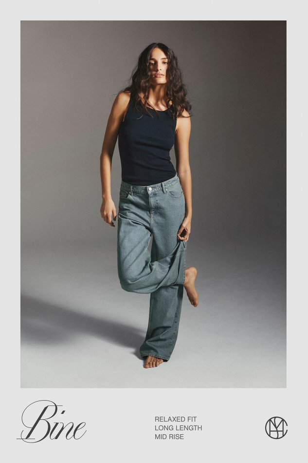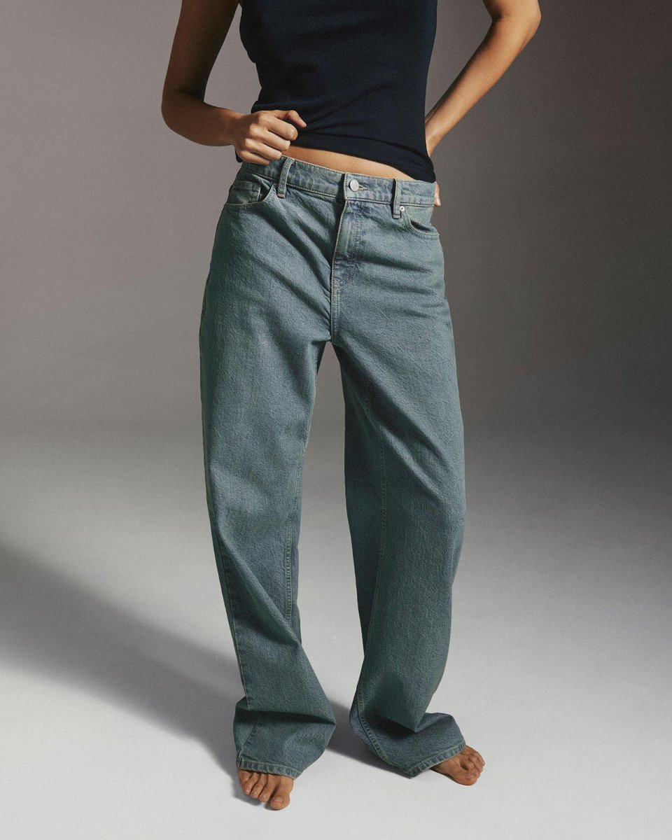 Relaxed fit jeans with a mid rise and long length give an effortless, relaxed silhouette. The mid rise sits just below the waist and the extended leg adds coolness while keeping the look modern and comfortable.