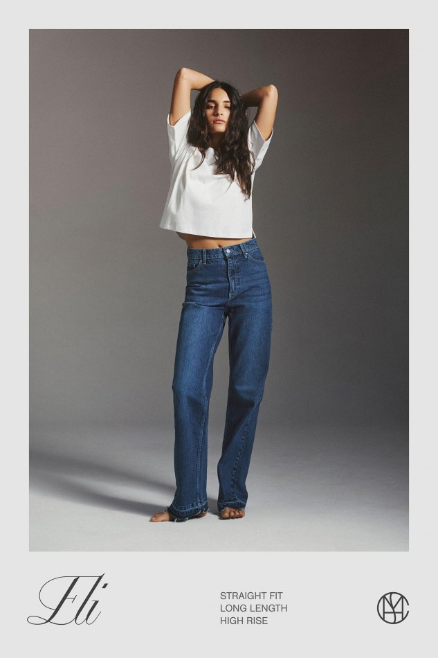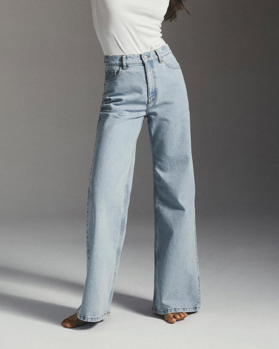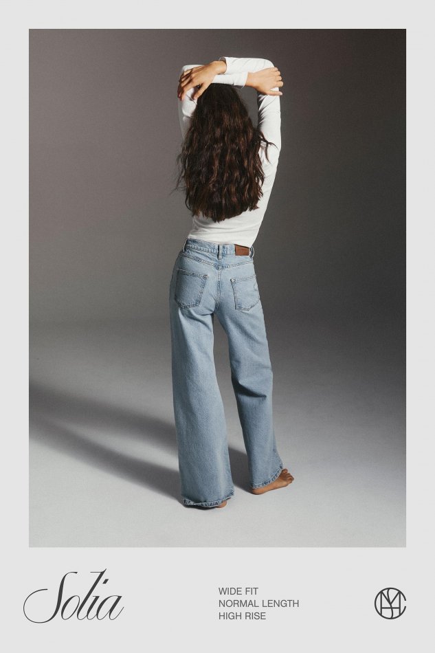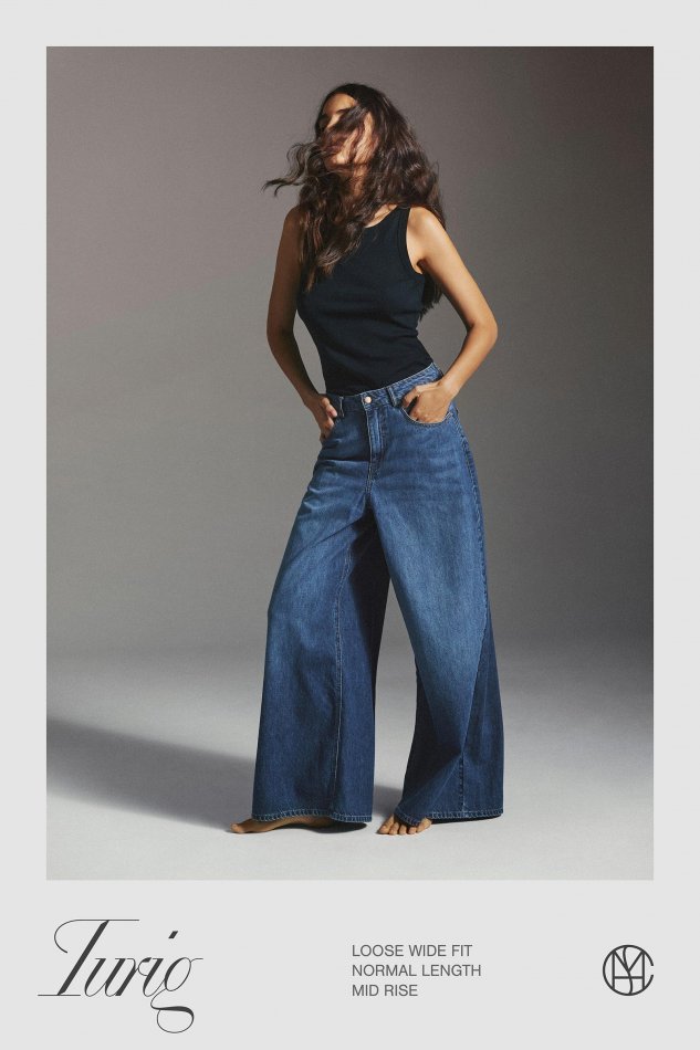 Wide fit jeans with a high rise and normal length create a flattering, balanced silhouette. The high rise defines the waist, while the wide leg adds a relaxed feeling giving a modern look that’s easy to style.